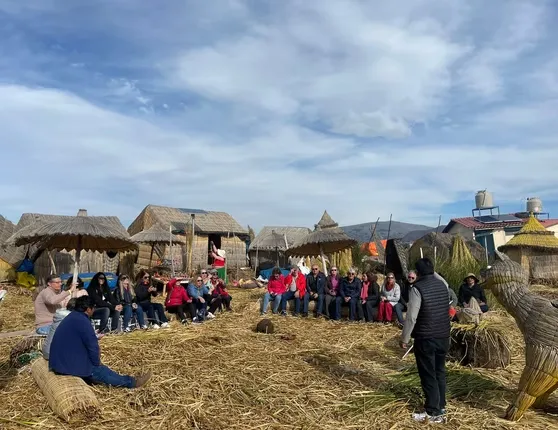Durante o passeio de barco, os viajantes visitam as famosas Ilhas Flutuantes dos Uros, construídas artesanalmente com totora — uma planta aquática típica da região.